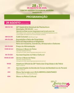 A 25ª edição da Festa das Orquídeas e do Peixe acontece de 28 a 31 de agosto em Maripá e deve atrair cerca de 60 mil pessoas ao longo dos quatro dias de programação. O evento celebra seu jubileu de prata, com entrada gratuita, grandes shows nacionais, feira de negócios, gastronomia, exposições e atrações culturais.