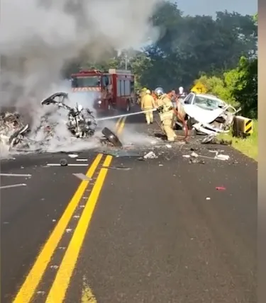 A colisão envolveu um caminhão de pequeno porte, uma camionete Fiat Toro e um automóvel Fiat Pálio.