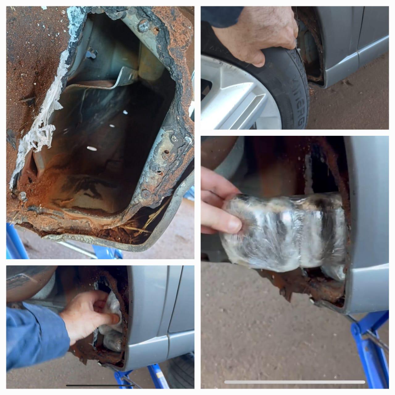 Durante abordagem, os policiais perceberam um forte odor da maconha no veículo e após buscas detalhadas, 30 barras de haxixe estavam escondidas em compartimento oculto, no interior da caixa de ar, abaixo da porta do condutor.